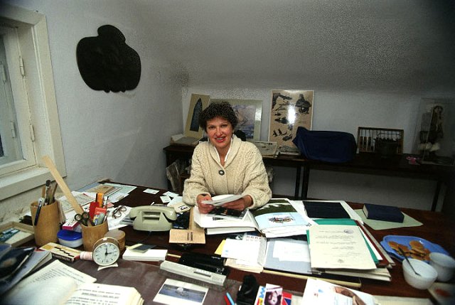 Nina at her desk in the Aleutsky Regional Study Museum, Nikolskoye, Bering Island.