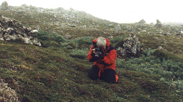 Photographing amidst the volcanic formations on the tundra. Pribilof Islands.