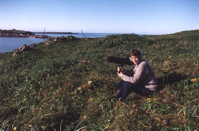 Helen using high a powered microphone for recording bird vocalization. Pribilof Islands.
